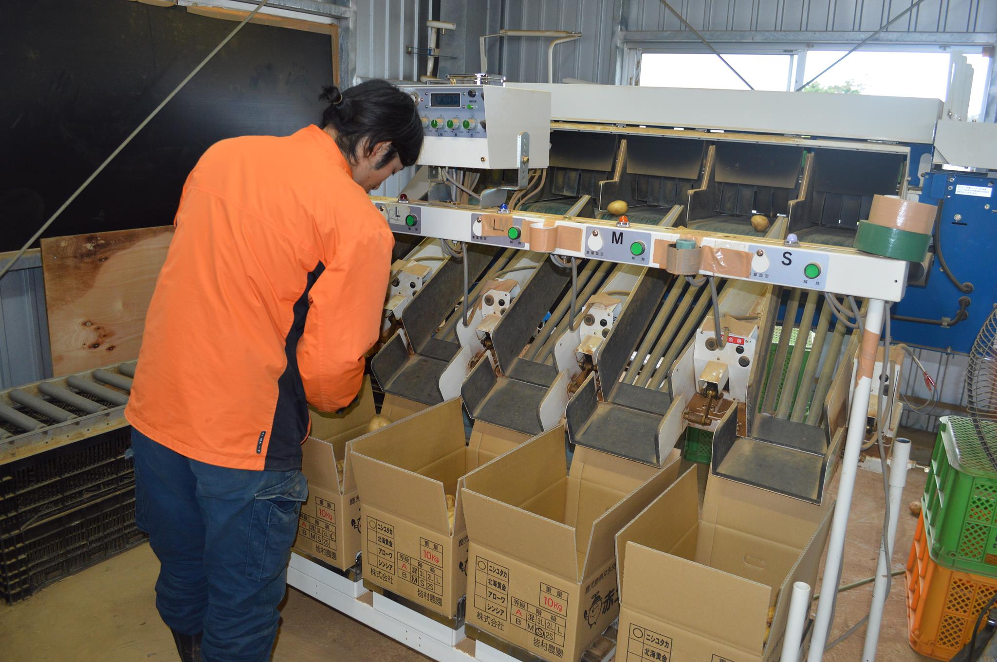 その後、商品になるものとならないものを人の目でチェックし、専用の選別機でS、M、Lサイズとジャガイモの大きさによって分け、箱詰めする事で商品となります。
